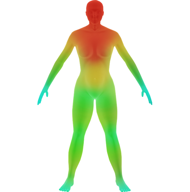 | 체열이 올라감에 따라 세포 대사가 빨라져 모발의 생존주기가 짧아짐. 점점 더 힘없고 가는 모발이 자라게 되며, 모발 개수 또한 감소됨. | 모발 | 모공당 2~3가닥으로 정상 굵기의 건강한 모발이 자람. |