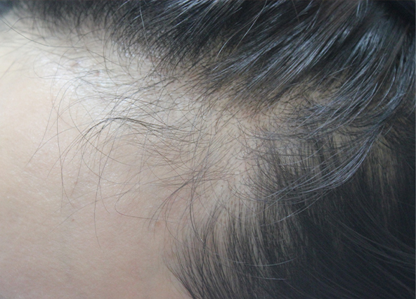 남성의 앞머리 탈모는 헤어라인이 올라가 이마처럼 변하는 경우가 많습니다. 이와 비교하여 여성은 뚜렷한 헤어라인의 후퇴보다는 헤어라인 위쪽의 모발이 마름모 꼴로 빠지거나, 헤어라인의 솜털이나 숱이 줄어드는 등 여성 특유의 앞머리 탈모 패턴을 보이게 됩니다.