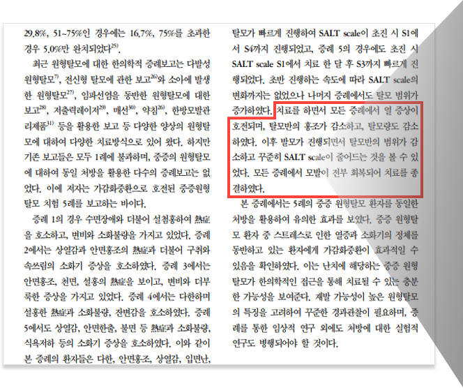 치료를 하면서 모든 증례에서 열 증상이 호전되며, 탈모반의 홍조가 감소하고, 탈모량도 감소 하였다. 이후 발모가 진행되면서 탈모반의 범위가 감 소하고 꾸준히 SALT scale이 줄어드는 것을 볼 수 있었다. 모든 증례에서 모발이 전부 회복되어 치료를 종결하였다.