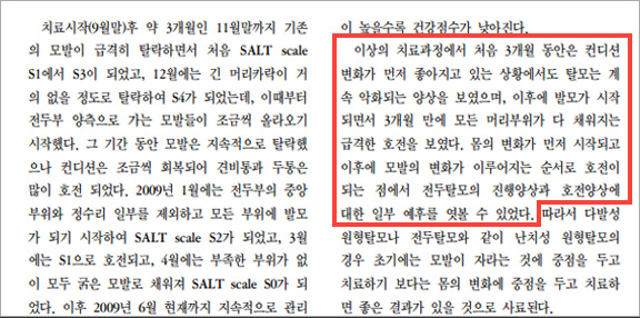 가급적 경증일 때 치료를 시작하는 것이 좋지만, 전두, 전신이라고 해서 불가능한 것은 아닙니다. 포기하지 마십시오.