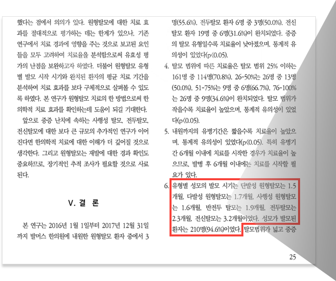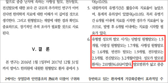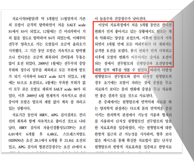 이상의 치료과정에서 처음 3개월 동안은 컨디션 변화가 먼저 좋아지고 있는 상황에서도 탈모는 계속 악화되는 양상을 보였으며, 이후에 발모가 시작 되면서 3개월 만에 모든 머리부위가 다 채워지는 급격한 호전을 보였다. 몸의 변화가 먼저 시작되고 이후에 모발의 변화가 이루어지는 순서로 호전이 되는 점에서 전두탈모의 진행양상과 호전양상에 대한 일부 예후를 엿볼 수 있었다.