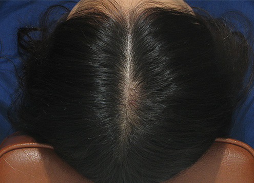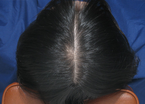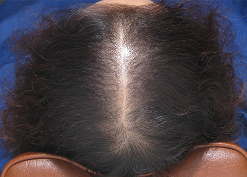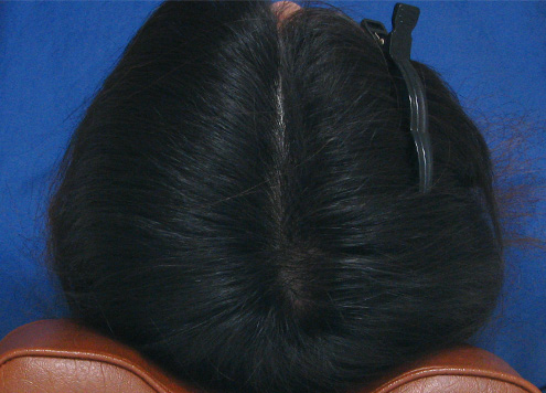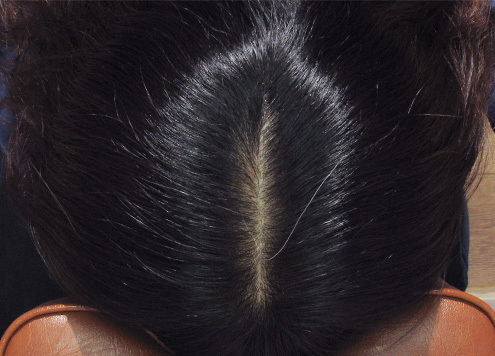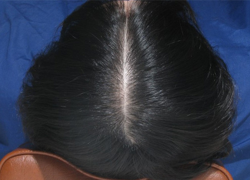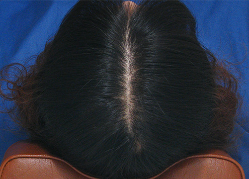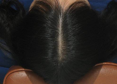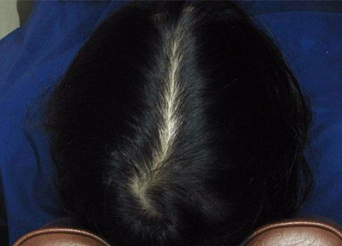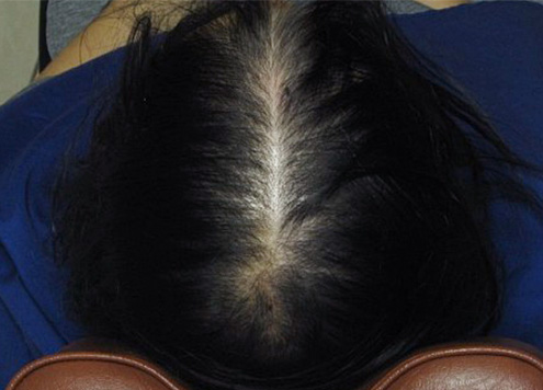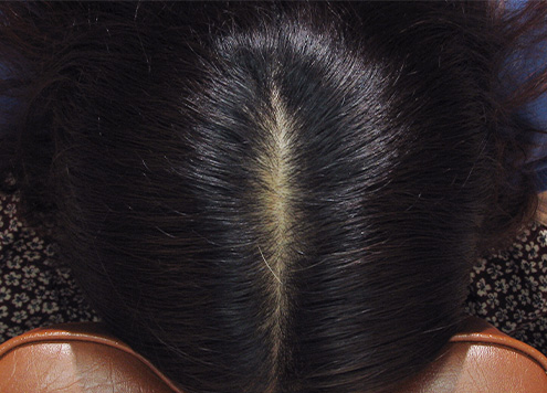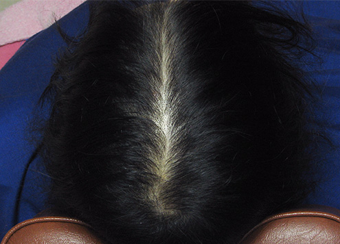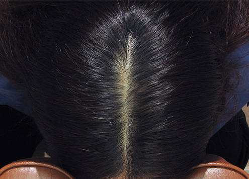 | 두피에 혈액이 정체되어 붉게 충혈됨. 피부 건조로 각질이 일어나기도 함. | 두피가 희고 깨끗함. |