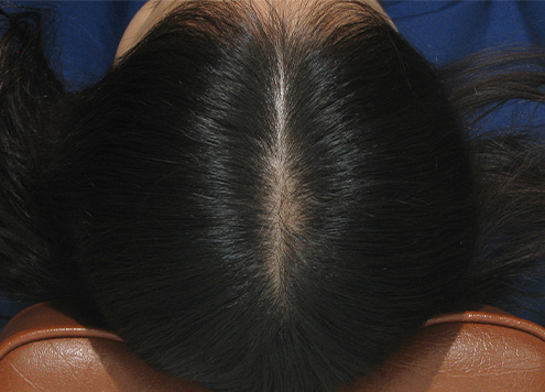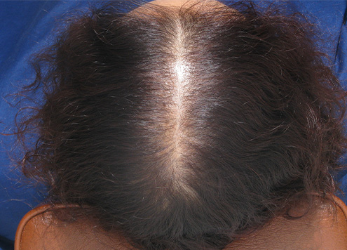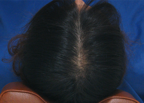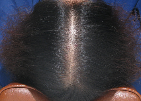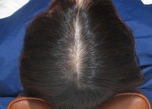 | 체열이 올라감에 따라 세포 대사가 빨라져 모발의 생존주기가 짧아짐. 점점 더 힘없고 가는 모발이 자라게 되며, 모발 개수 또한 감소됨. | 모발 | 모공당 2~3가닥으로 정상 굵기의 건강한 모발이 자람. |