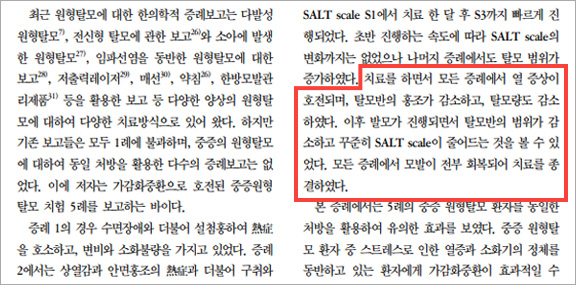 치료를 하면서 모든 증례에서 열 증상이 호전되며, 탈모반의 홍조가 감소하고, 탈모량도 감소 하였다. 이후 발모가 진행되면서 탈모반의 범위가 감 소하고 꾸준히 SALT scale이 줄어드는 것을 볼 수 있었다. 모든 증례에서 모발이 전부 회복되어 치료를 종결하였다.
